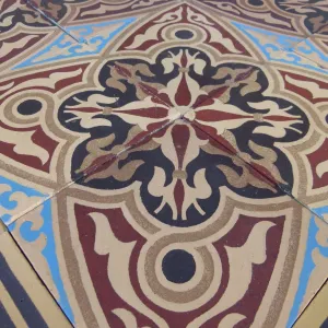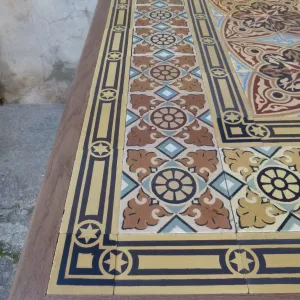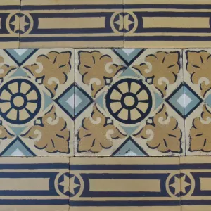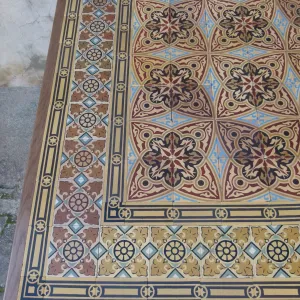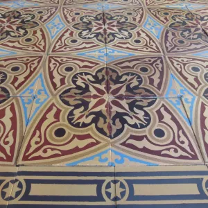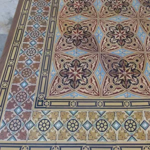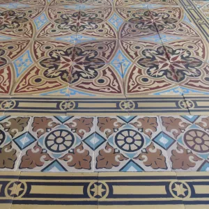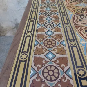 In the latter stages of restoration, a fine French ceramic floor in a beautifully detailed Moorish theme, complete with its original same size borders.
