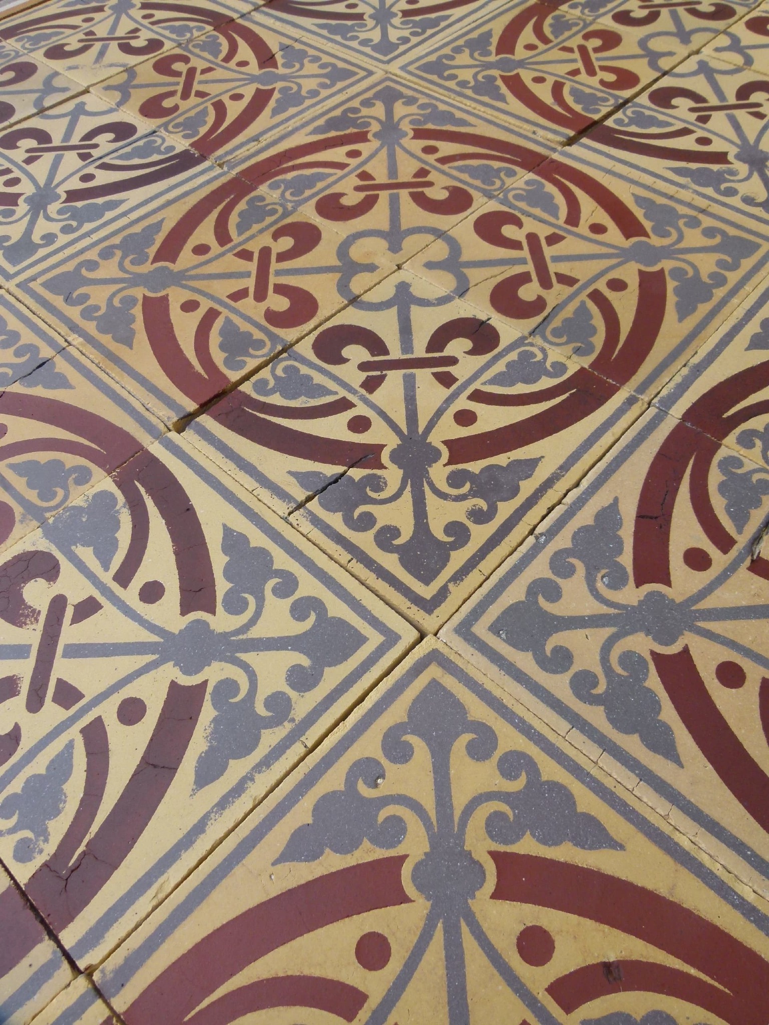 In the latter stages of restoration, a preview of a rare, French floor manufactured in the late 19th century by Carrelages Ceramiques Boch Freres Maubeuge. 6.8 inch, 3lb ceramic tiles, for a surface of +/- 136 sq ft.