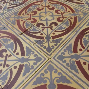 Our antique tiles were originally handmade in single or two tile molds. Pre-computer fabrication these molds were machined by hand & the colour slips to create the tile were mixed by measure and eye. When firing the tiles, the kiln temperatures of c.1,100F degrees could also be variable. The result of this production process is that tiles made during this period of non-automation often display subtle size & thickness variations and there can be tonal variations in colors, all of which add to their charm and uniqueness. When photographing a floor, we always take a random section so that it is representative of the whole in tones and patina.