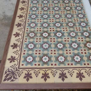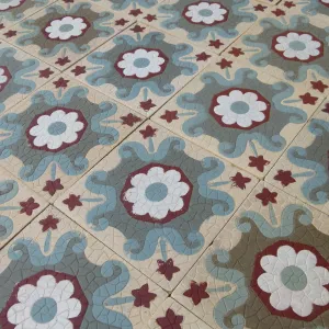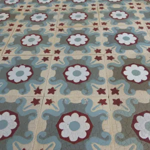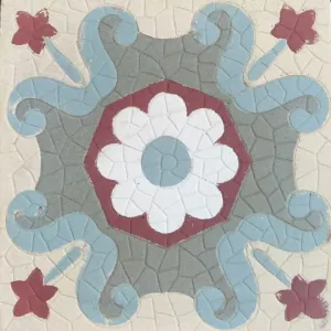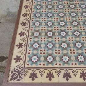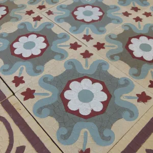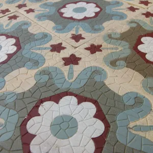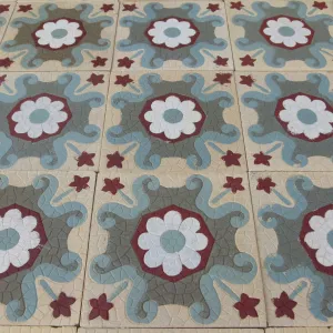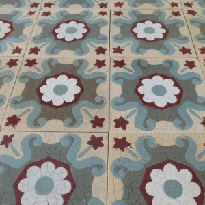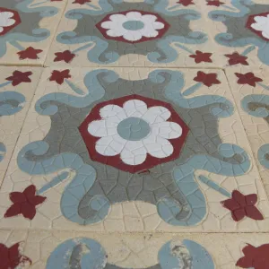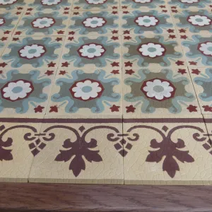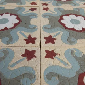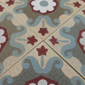 Our antique tiles were originally handmade in single or two tile molds. Pre-computer fabrication these molds were machined by hand & the colour slips to create the tile were mixed by measure and eye. When firing the tiles, the kiln temperatures of c.1,100F degrees could also be variable. The result of this production process is that tiles made during this period of non-automation often display subtle size & thickness variations and there can be tonal variations in colors, all of which add to their charm and uniqueness. When photographing a floor, we always take a random section so that it is representative of the whole in tones and patina.