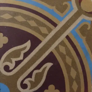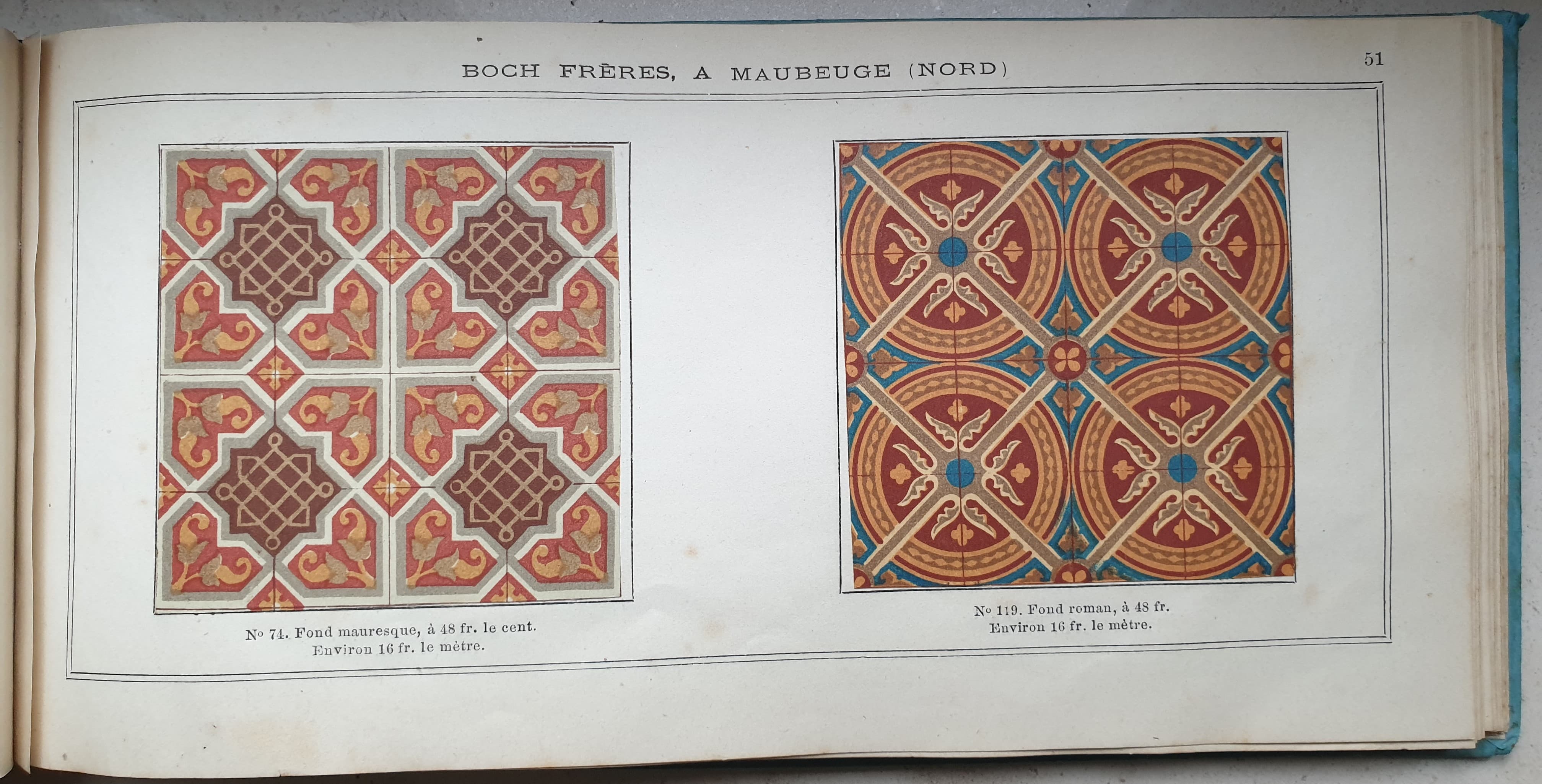 43 antique French ceramic encaustic tiles dating from the early 20th century, manufactured by Carrelages ceramiques Boch Freres, Maubeuge, France. 6.8 inches sq and 0.55 inches thick the individual tile tessellates to open its motif across four tiles. We include in the photo gallery a scan from the 1881 Boch Freres catalogue presenting the tiles.