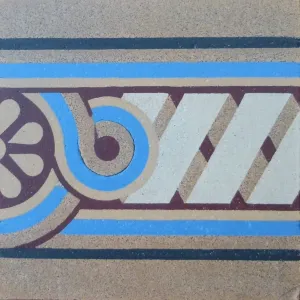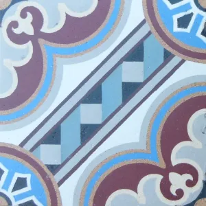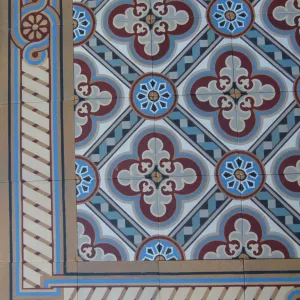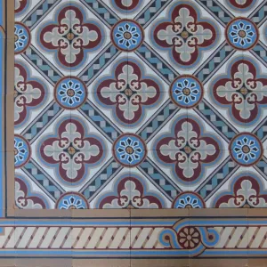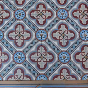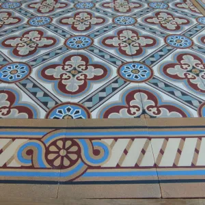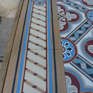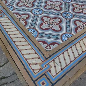 The floor design showcases remarkable attention to detail and mastery of technique. At its heart lies a principal field tile of striking, almost airbrushed quality finesse, bordered by an elegant same size helix motif. These border tiles are enhanced by the presence of a blue jewel motif linking tile, creating a rhythmic and sophisticated interplay between form and color. All tiles have been carefully reclaimed and thoughtfully restored, preserving the integrity and charm of the original craftsmanship.