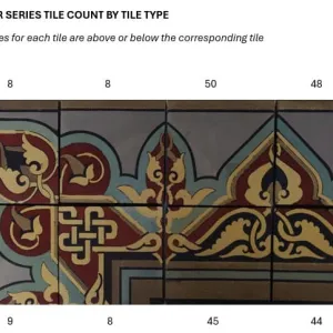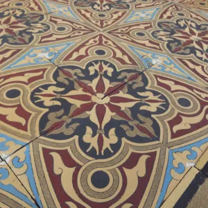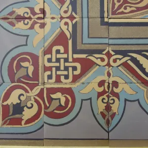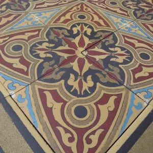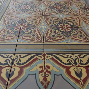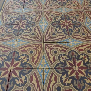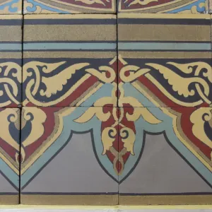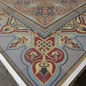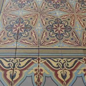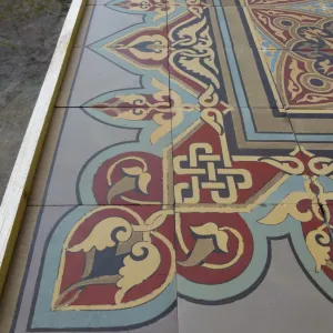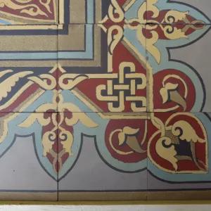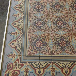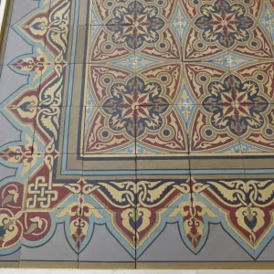 The total surface area is 185 sq ft, being 360 field tiles totalling 115 sq ft, plus the double border series. Within the gallery, displaying a randomly selected section of the floor for photography, there are the individual tile counts for the borders. This is a floor deserving of being the hero in its new location and, given its uniqueness, one that is guaranteed to be a talking point when seen.