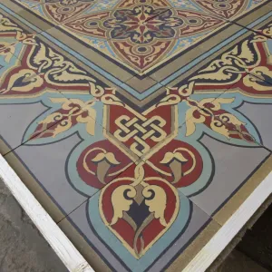 The floor is in excellent condition, it has cleaned superbly of years of surface wax and dirt to once again display rich colors in a deep slip and the old mortar to the reverse and sides has been slowly removed. The tiles arrive ready to relay, inside or outside of the home.