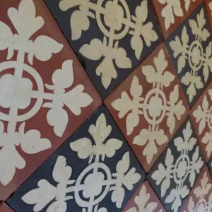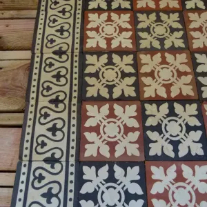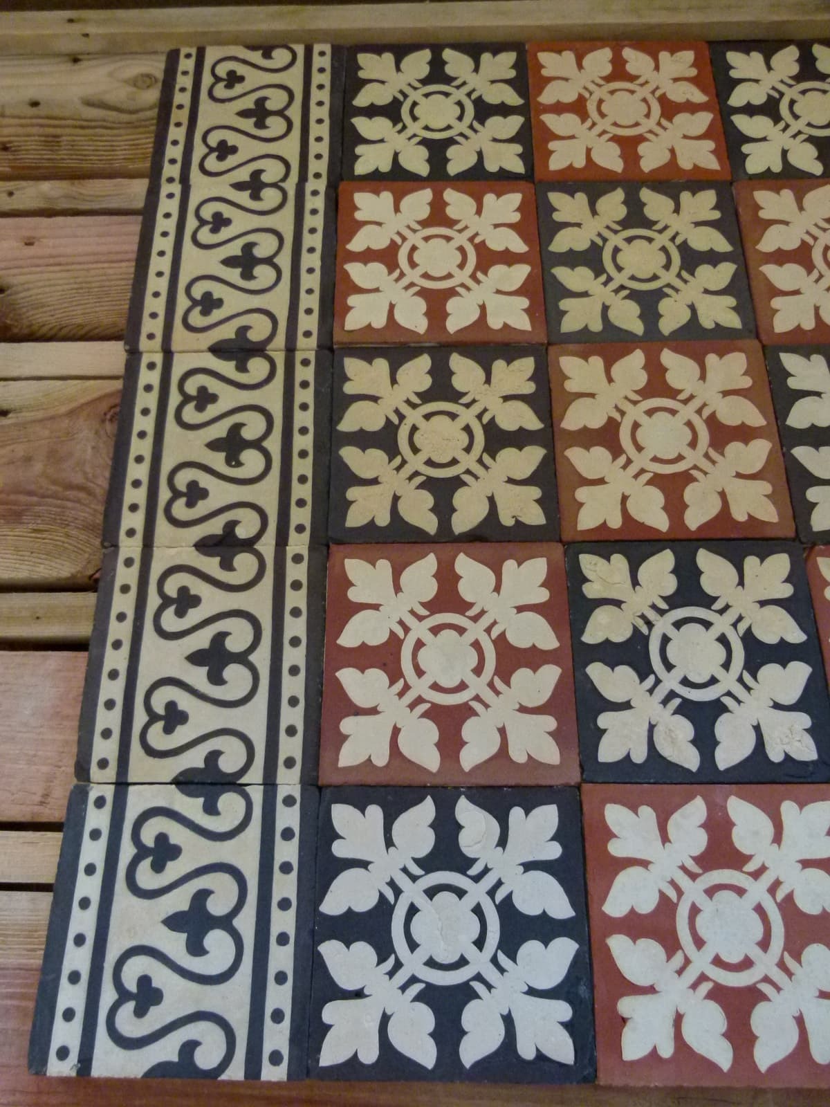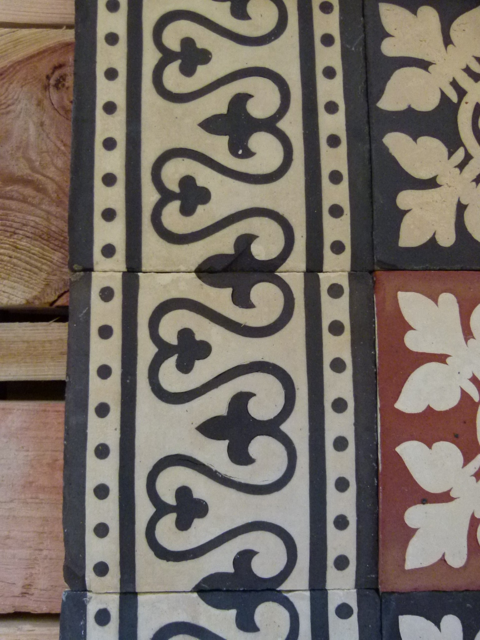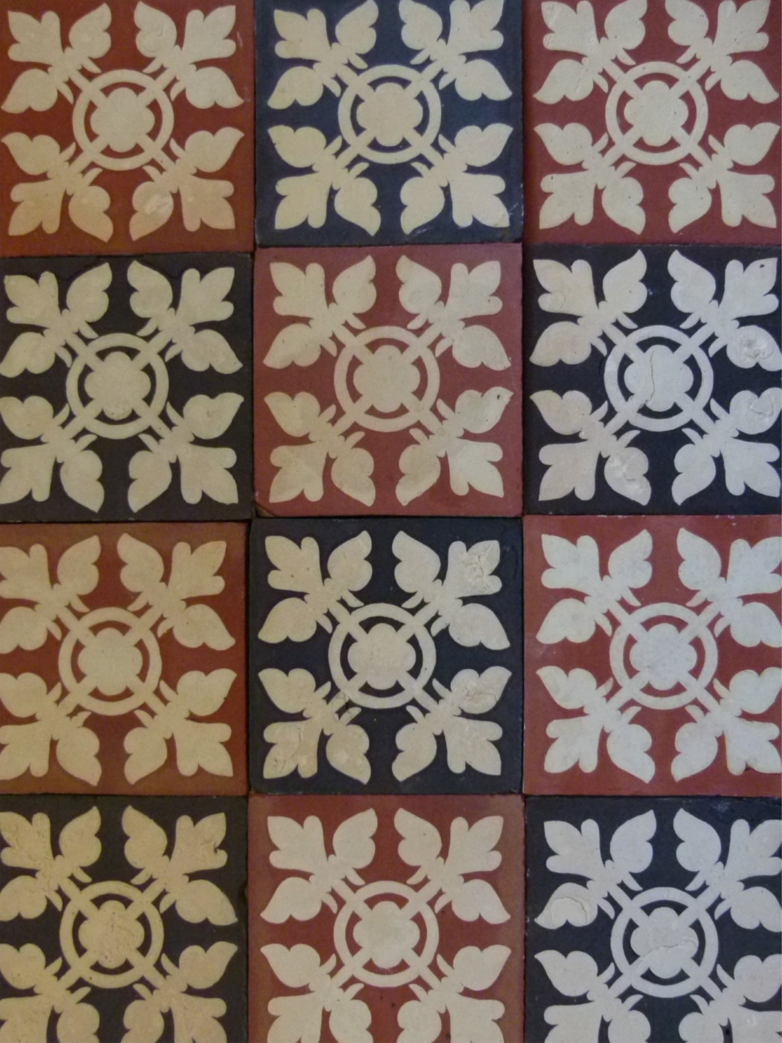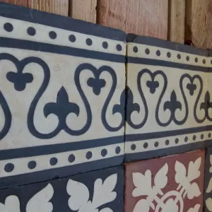 Our antique tiles were originally handmade in single or two tile molds. Pre-computer fabrication these molds were machined by hand & the colour slips to create the tile were mixed by measure and eye. When firing the tiles, the kiln temperatures of c.1,100F degrees could also be variable. The result of this production process is that tiles made during this period of non-automation often display subtle size & thickness variations and there can be tonal variations in colors, all of which add to their charm and uniqueness. When photographing a floor, we always take a random section so that it is representative of the whole in tones and patina.