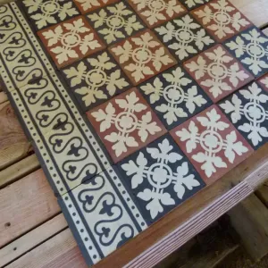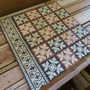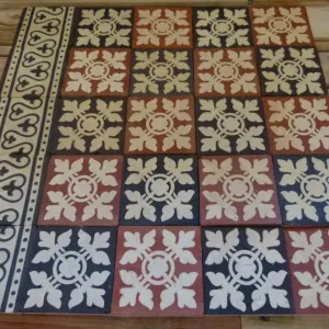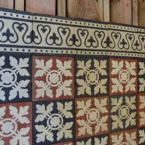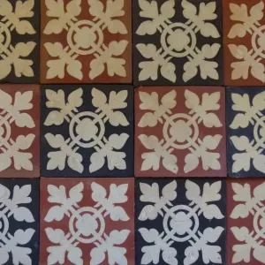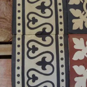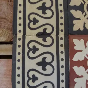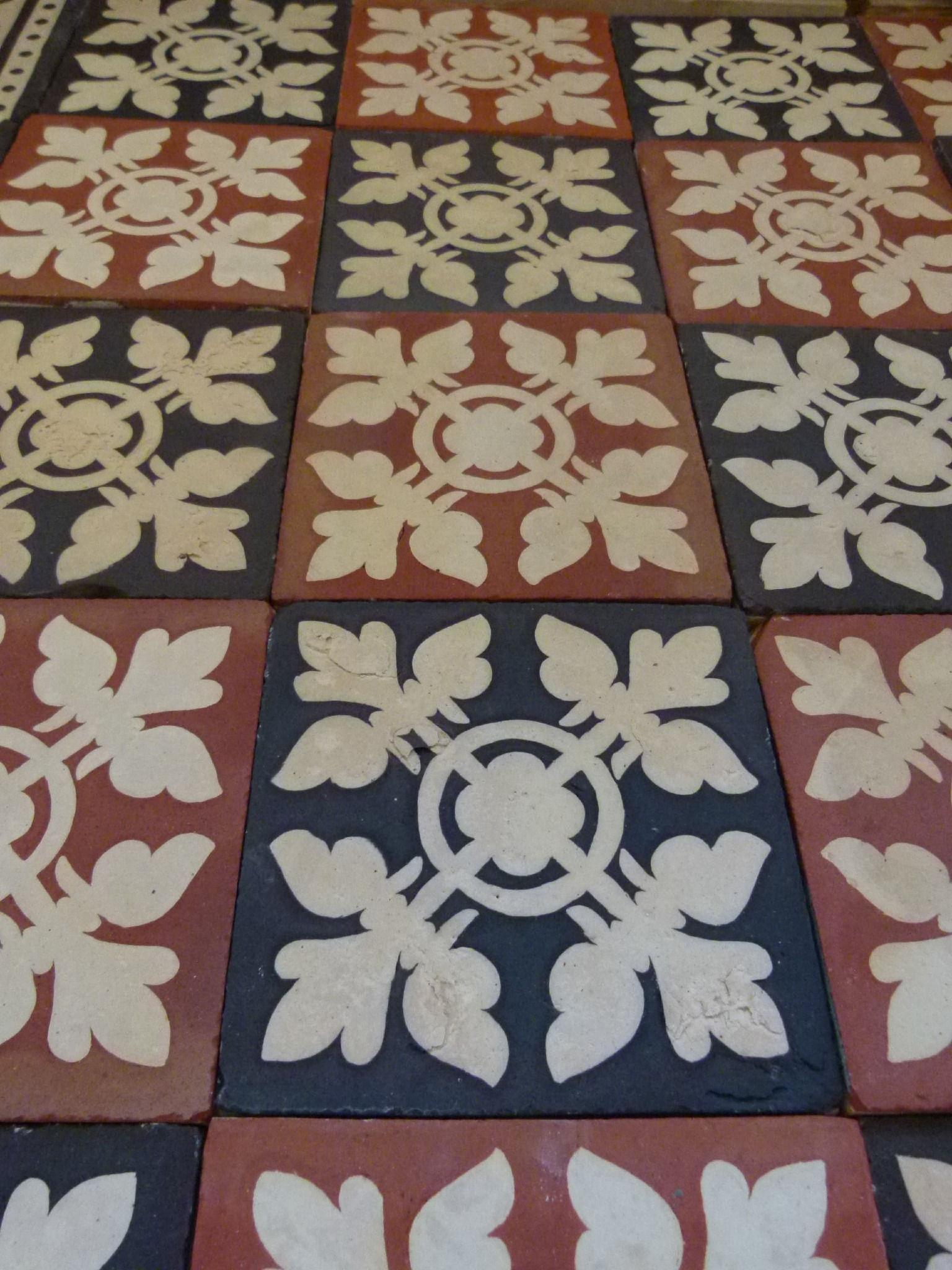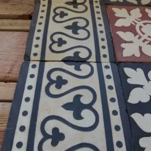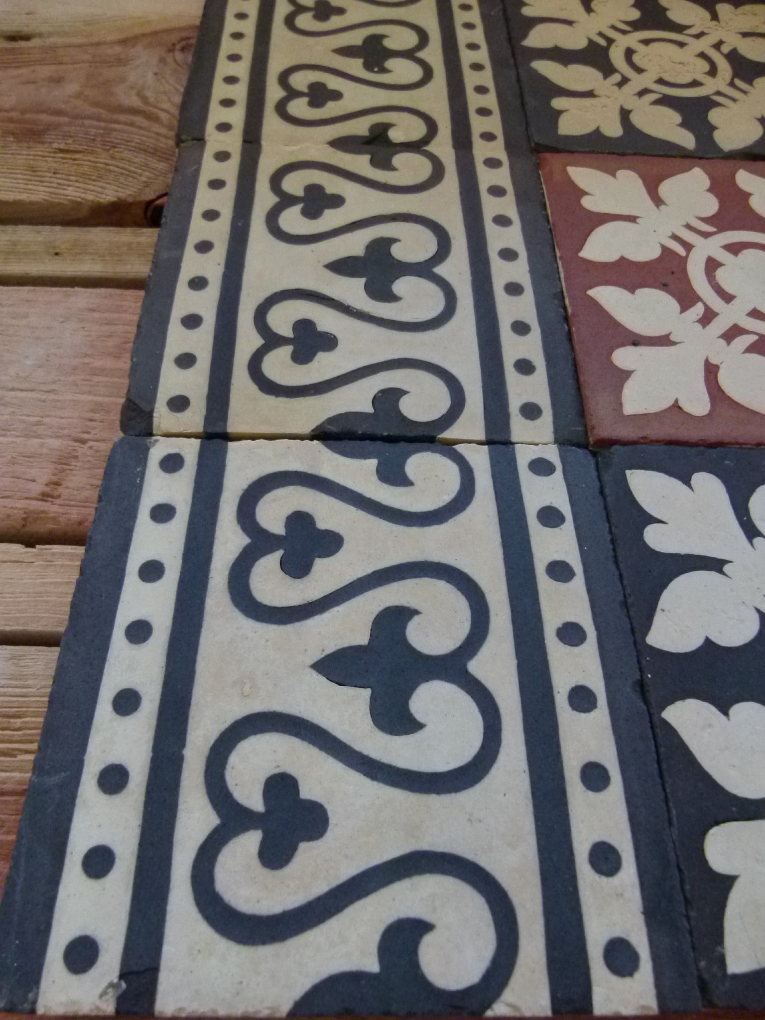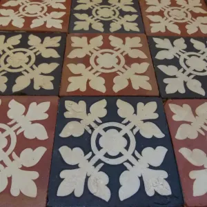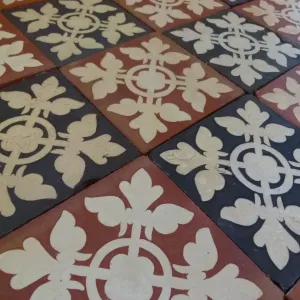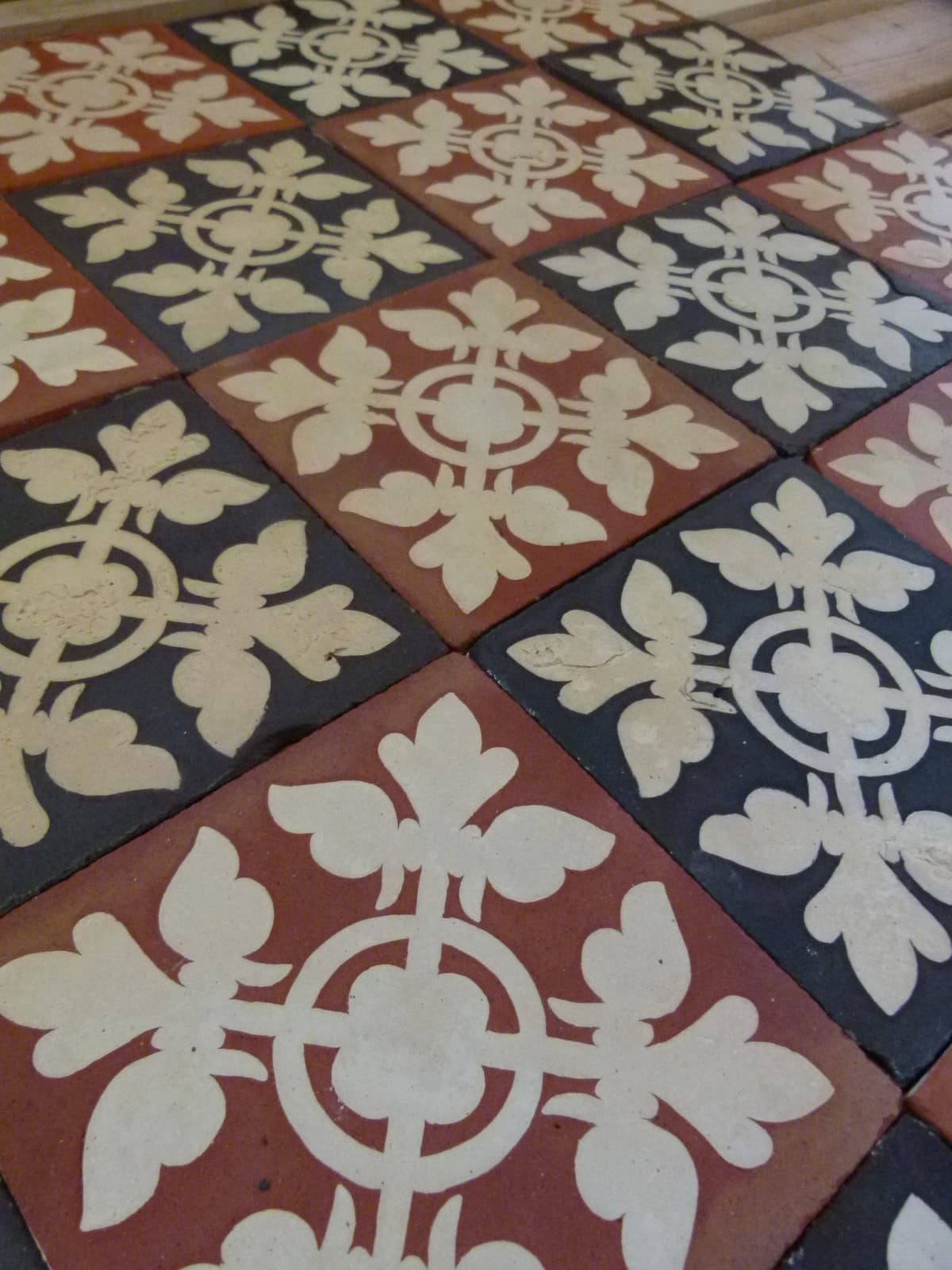 Our antique tiles were originally handmade in single or two tile molds. Pre-computer fabrication these molds were machined by hand & the colour slips to create the tile were mixed by measure and eye. When firing the tiles, the kiln temperatures of c.1,100F degrees could also be variable. The result of this production process is that tiles made during this period of non-automation often display subtle size & thickness variations and there can be tonal variations in colors, all of which add to their charm and uniqueness. When photographing a floor, we always take a random section so that it is representative of the whole in tones and patina.