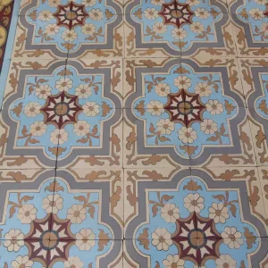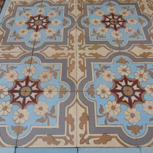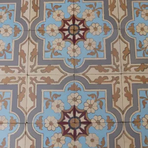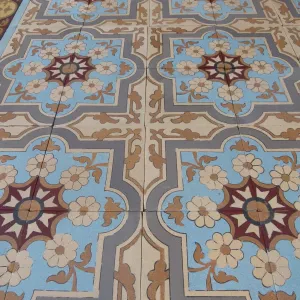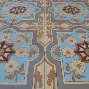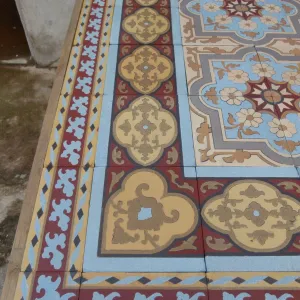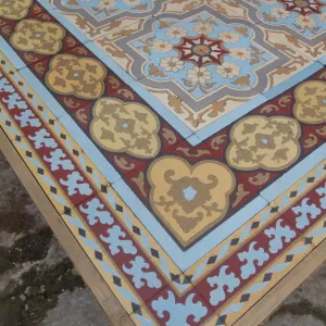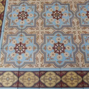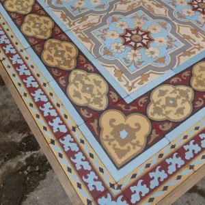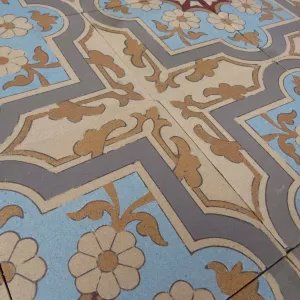 The floor's geometry is meticulous. Four-tile tessellations form interlocking floral crosses and curling vegetal motifs—an elegant synthesis of late 19th-century romanticism and the emerging symmetry of Art Nouveau. The design’s rhythmic cohesion is framed by a large border bearing a strong Moorish influence—geometric, bold, and highly ornamented—balanced by a half-size border that lends finesse to the outer edge. This double border layout replicates the floor’s original installation.